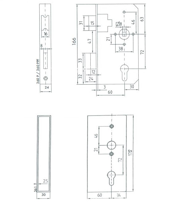 Details zu "60-Dorn Schloss mit Schlosskastengehäuse (30 mm) / rs+ls verwendbar / 72mm / 8mm / Nr. 360/361P"