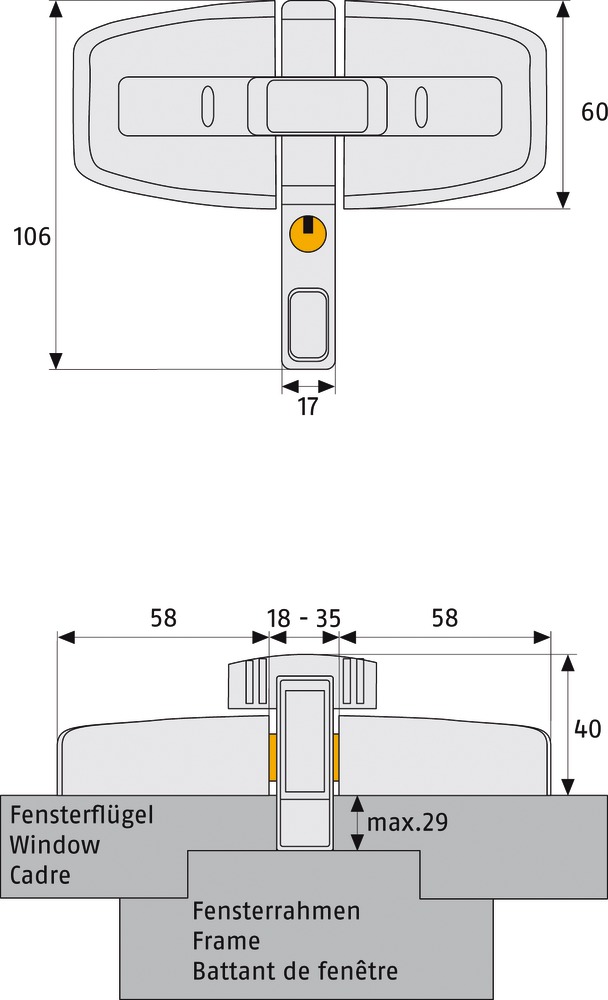 • Abmessung Schlosskastenteil: 106 x 17 mm (notwendiger Platz zwischen dem Fensterflügel: 18-35 mm)!