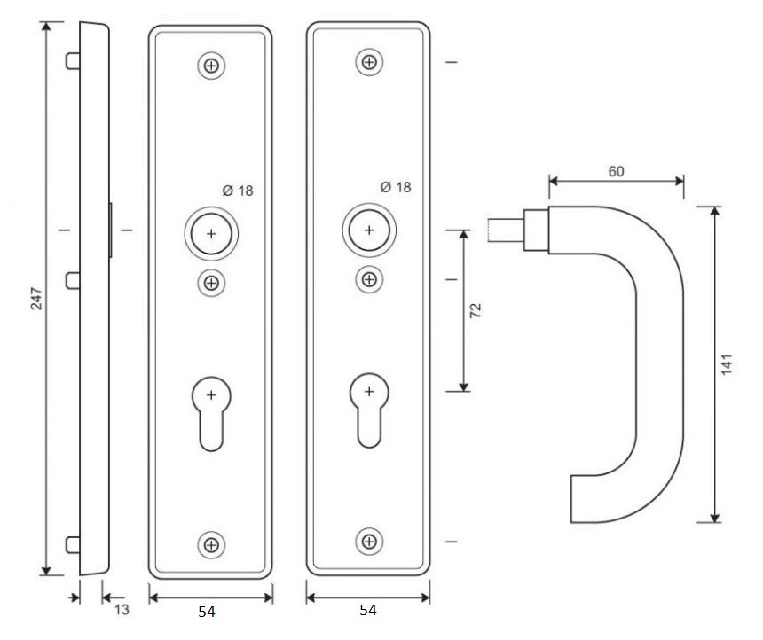 Details zu "Alu-Schutzdrückergarnitur / F1-elox. / ES0 15 mm stark / 72 mm Entfernung"