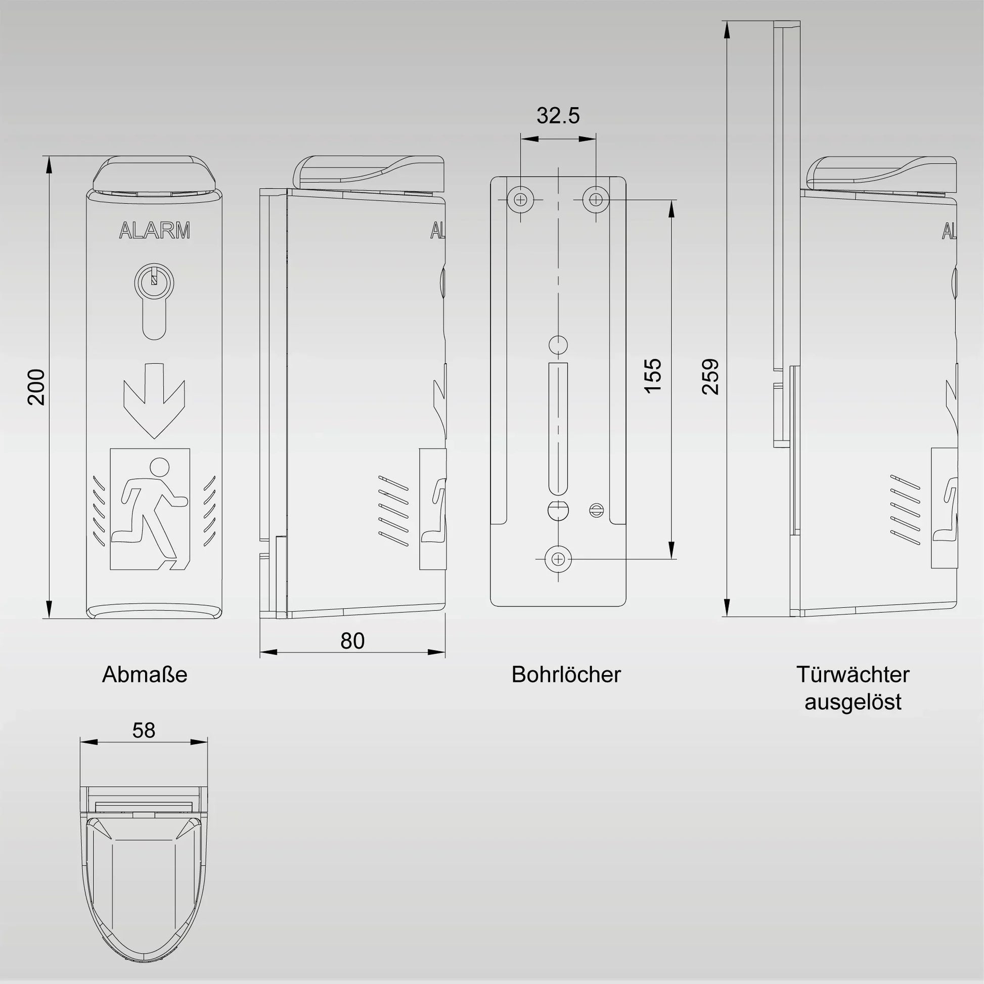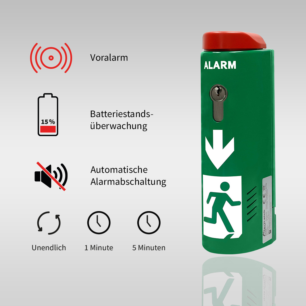• mit Hilfe des Schlüssels lässt sich der Daueralarm von einer berechtigten Person abschalten / automatische Alarmabschaltung einstellbar (Alarm dauerhaft, Alarm für 1 oder 5 Minuten)