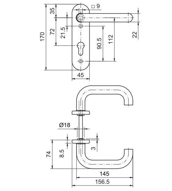 Details zu "FH-Verdeckschild-Drückerkurzbeschlag / 9 mm / Nr.: 307100 / F1-elox. / festdrehbar / 72 mm"