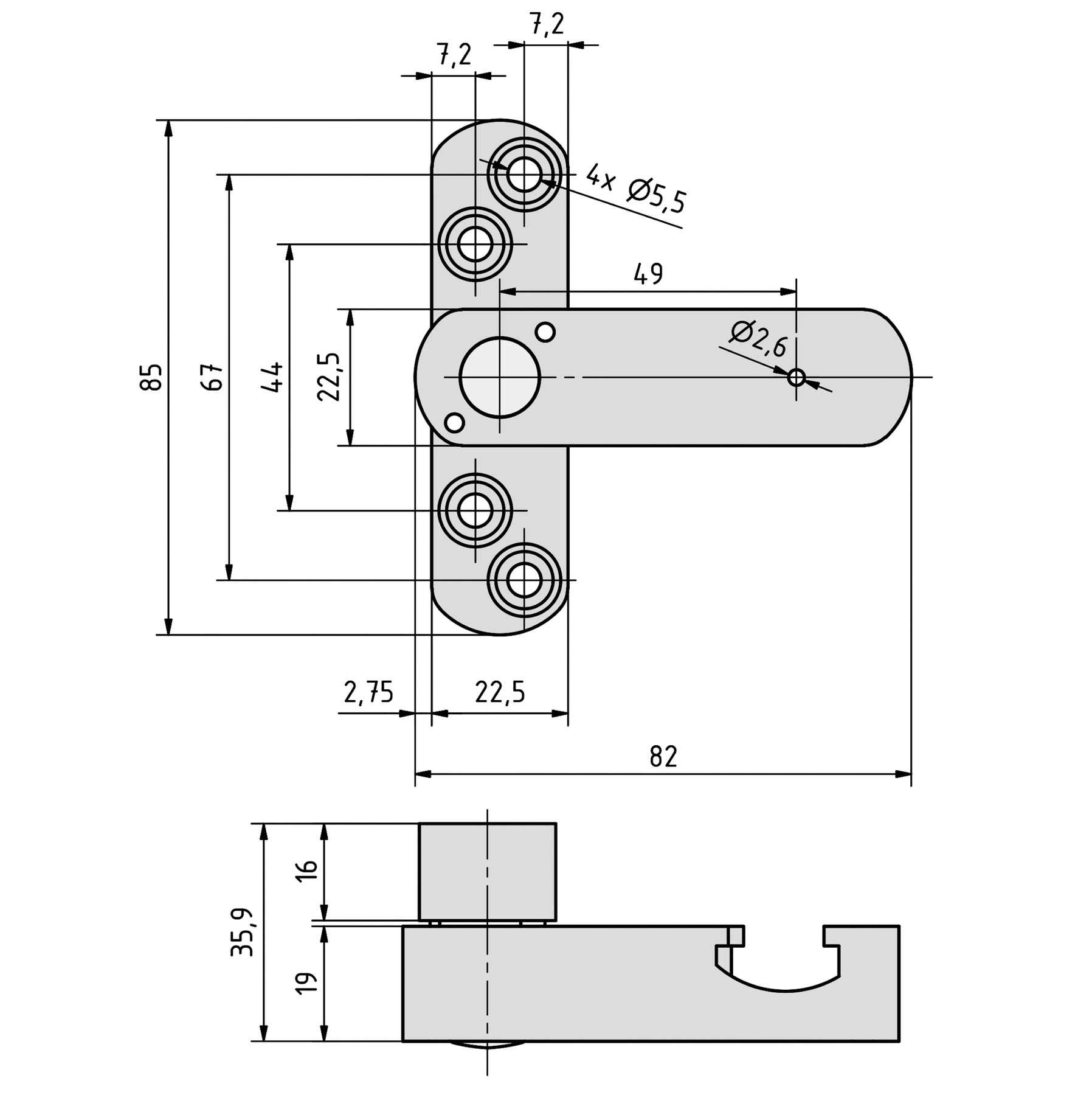 • Abmessung des schwenkbaren Arms bei ausführung "1-flügelig": 55 x 22,5 mm