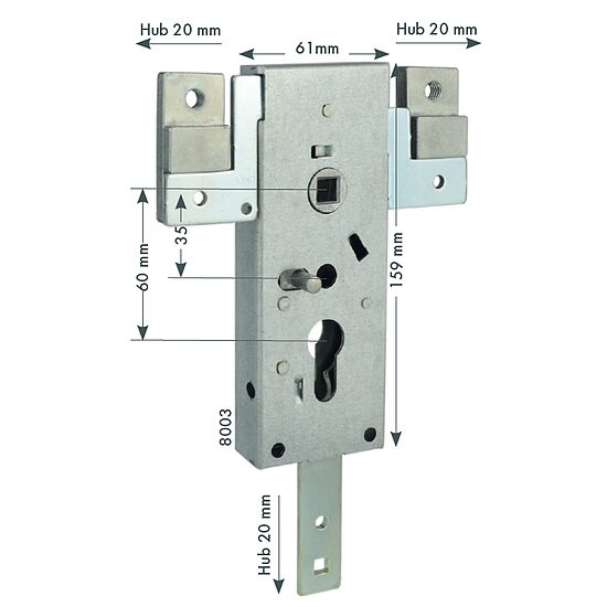 Details zu "Garagentorschloss/ 159x59 mm / 60 mm Entfernung / Kombination: seitlicher Ausschluss und nach unten/"