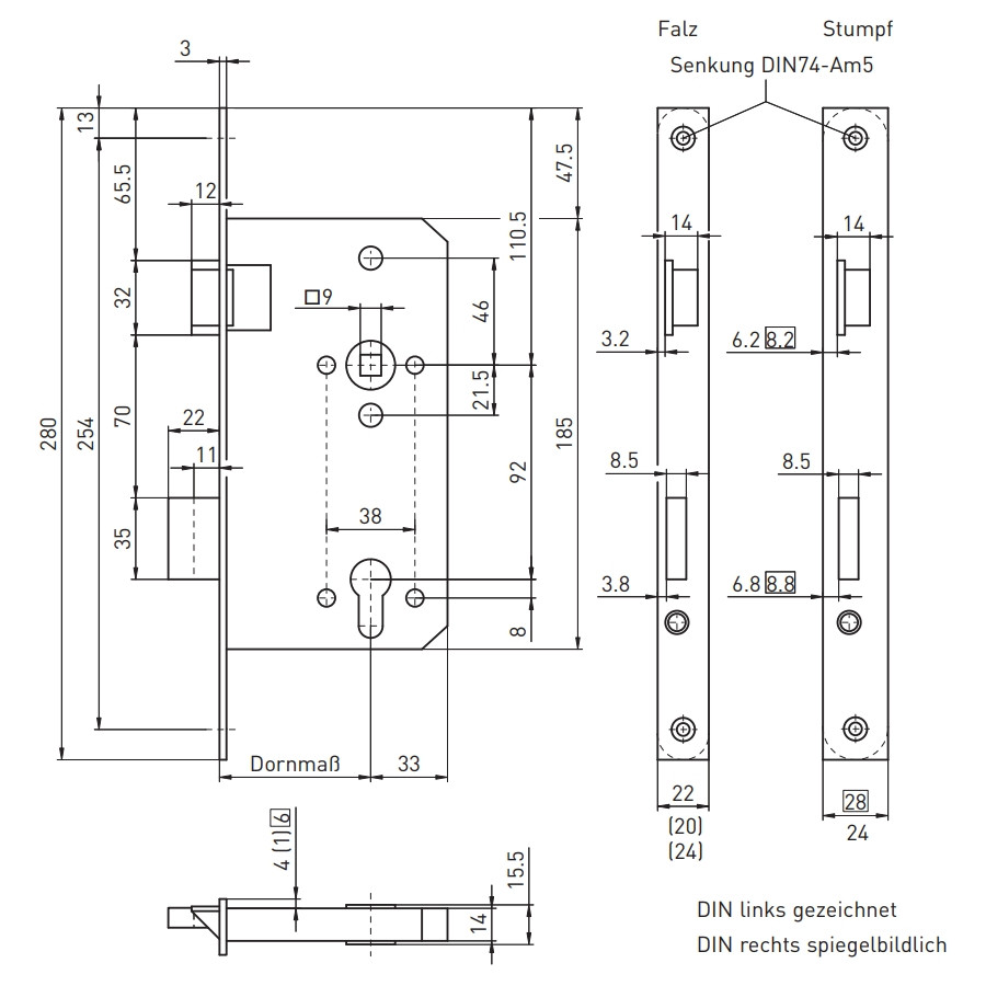 Details zu "Haustür-Panikschloss Funktion "E" / 92 mm / DLS / 65-Dorn / Stulp: 280 x 20 mm käntig / 9 mm Nuss"