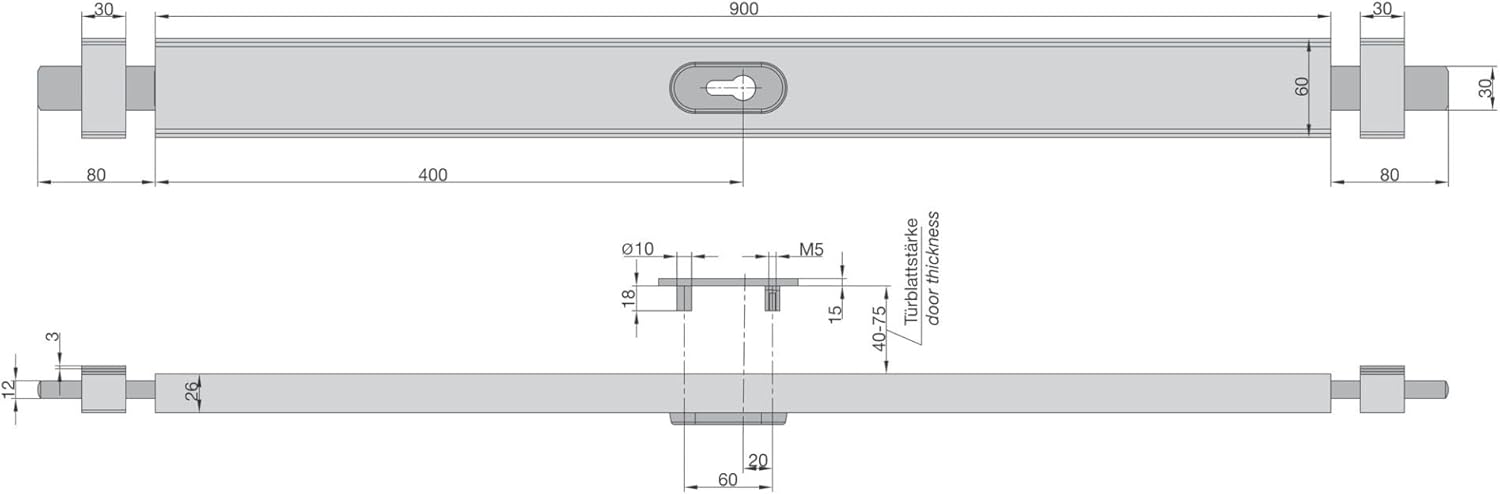 • Riegelausschluss: beidseitig 80 mm mit einer Schlüsseldrehung