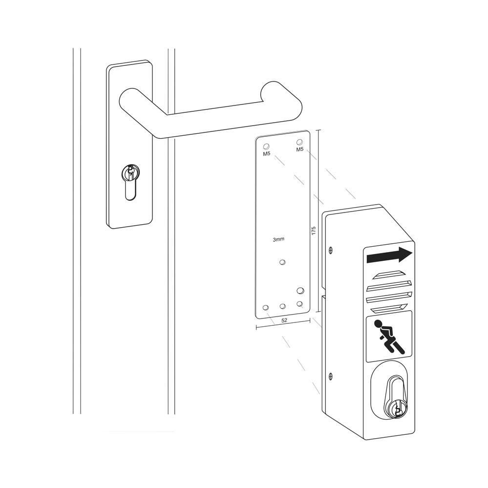 - Funktionsprüfung: Nach der Montage muss sichergestellt werden, dass der Alarm beim Herunterdrücken der Klinke auslöst und der Schlüssel zur Quittierung einwandfrei funktioniert.
