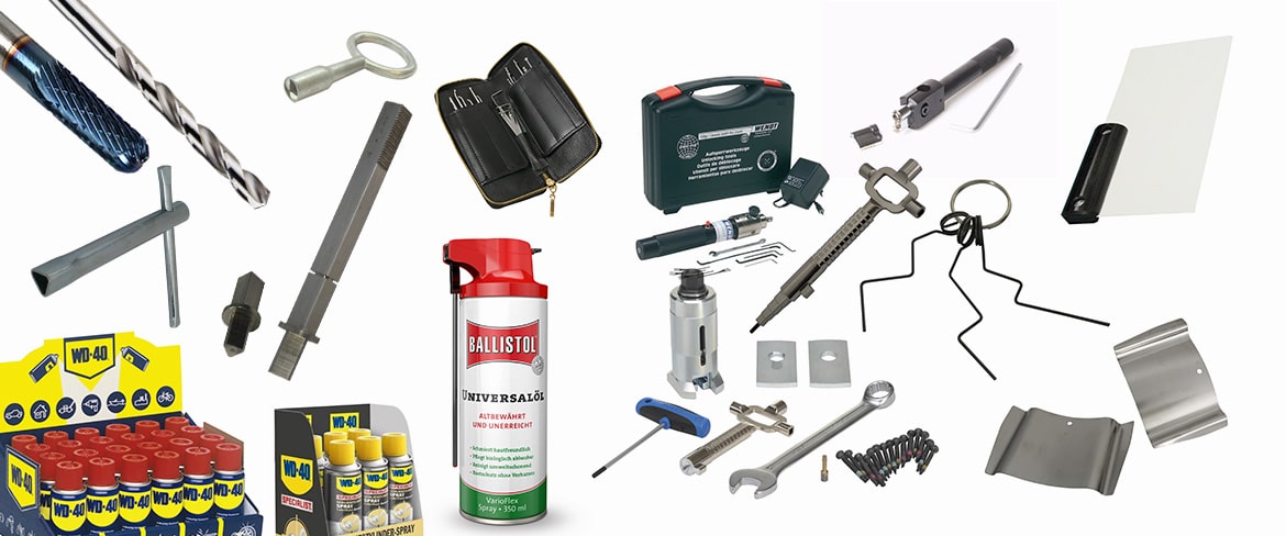 Die Werkzeuge in diesem Bereich unseres Shops sind sorgfältig für Sie ausgewählt und auf die Montage und Wartung unserer Schlösser, Profilzylinder und Beschläge abgestimmt. Hartmetallbohrer, Fräser und Lochsägen sowie alle zur Öffnungstechnik gehörenden Werkzeuge halten wir für Sie bereit. Für die Pflege bieten wir Ihnen alles vom Multifunktionsöl bis hin zu speziellen Schließzylindersprays namhafter Markenhersteller wie Ballistol, WD40, Benson und Brunox.