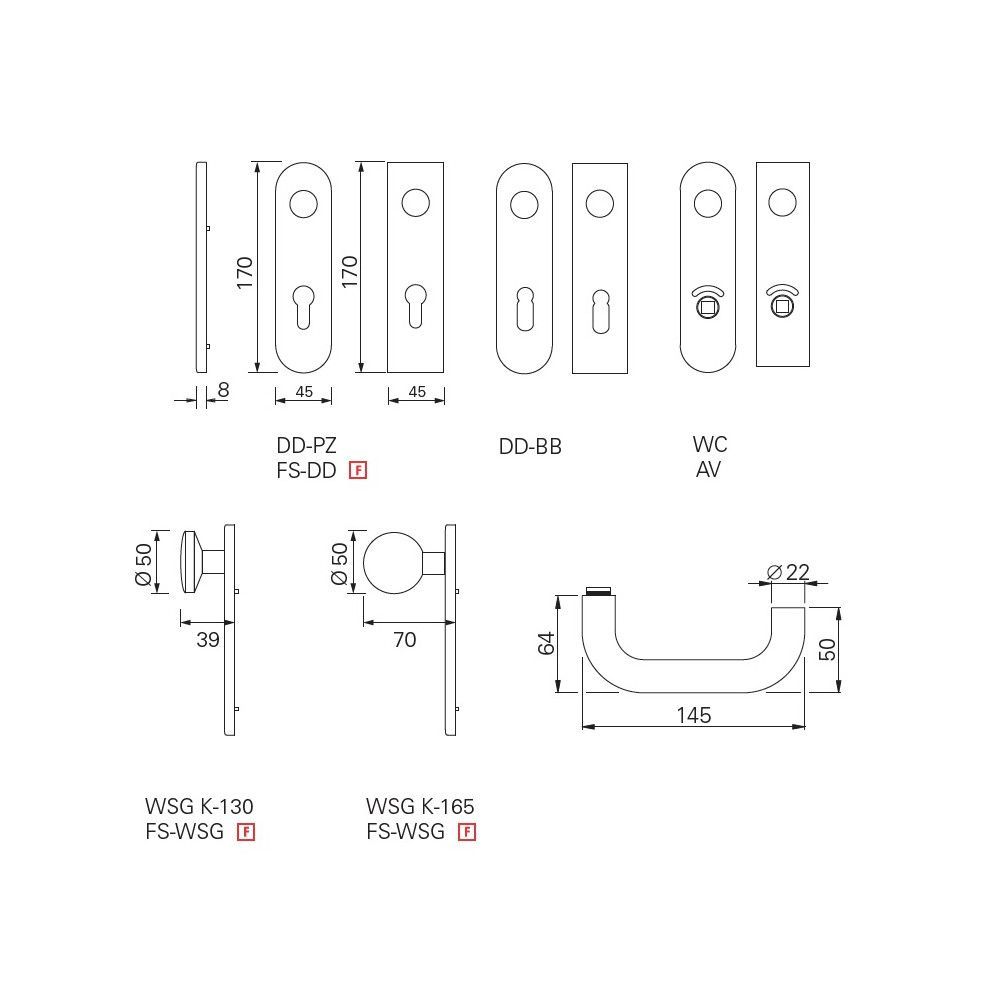 Ztr.-Kurzschild-Drückergarnitur / 8 mm BB-gelocht / Nr. 106500-BB / Edelstahl
